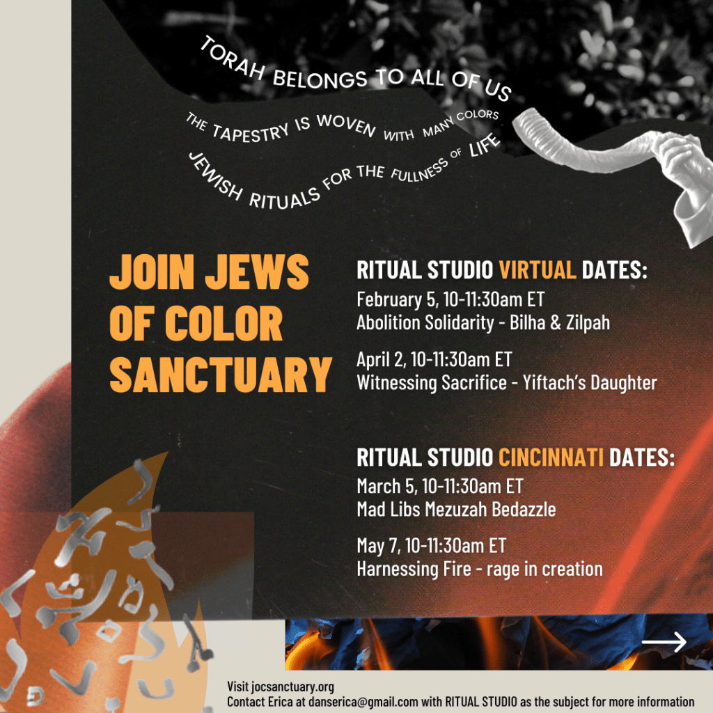 Join Jews of Color Sanctuary on 1st Sundays in 2023 for an interactive Ritual Studio experience centering Jewish people of color, skills for creating Jewish ritual, and a sprinkling of art and Torah.